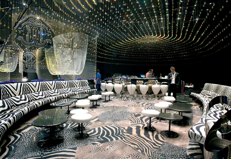 The interior of the Club showcases design elements that are typical of Cavalli and include animals prints. The fashionable venue is a spot where the elite of the city mingle and come to enjoy food, music and dancing. The Cavalli Club transforms as the night progresses and start off as a high end restaurant. As the night wears on they staff quietly converts the interior into a lounge and eventually into a club.