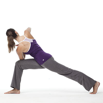 The arms remain in the same position as before. The left foot is lunged back and stretched till the right knee is perpendicular. Remain in this position for about 8 seconds or 5 breaths.