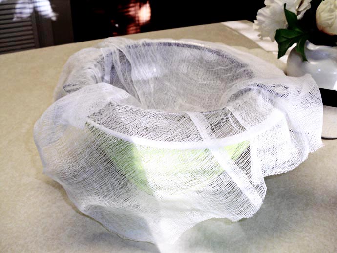 Line a large bowl with a large piece of cheesecloth that has been folded twice or thrice, to create a number of layers. Make sure it covers the bowl completely, with the corners dangling down the sides of the bowl. Once this is ready, start spooning the crushed fruit mixture onto the cheesecloth. Fill it up, but make sure you leave room at the edges.