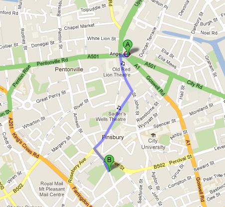 From the Angel tube station nearby, move West on City Rd/A1 towards Upper St. Turn left onto St. John St/A401 and then right onto Rosebery Ave/A401. Turn left onto Rosoman St and then right onto Rosoman Pl. Turn left onto Northampton Rd and the restaurant will be on your left. To have a look at the detailed route map, click walking directions to A La Cruz.