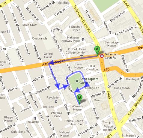 Tottenham Court Road tube station will be your destination if you want to travel by tube. Leave station on Oxford Street, head east towards Tottenham Court Road and turn right onto Charing Cross Road. Now travel straight on this road for a minute and take a right turn onto Sutton Row. Walk for three to five minutes on this road, take a left turn onto Soho Square, stay with it and turn left onto Frith Street. Your destination will be on the right. View Map