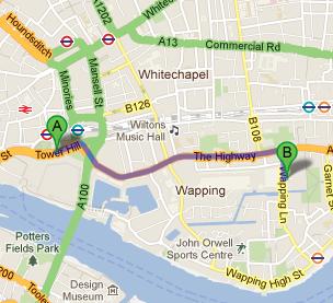 Tower Hill tube station is at a distance 0.9 miles from the Tobacco Dock Shopping Centre. From the Tower Hill tube station head east on Tower Hill/A100 towards Minories/A1211 and continue onto Minories/A1203. Turn right onto Wapping Lane, take the second left onto Tobacco Dock Car Park and you will find the destination on the left.view map