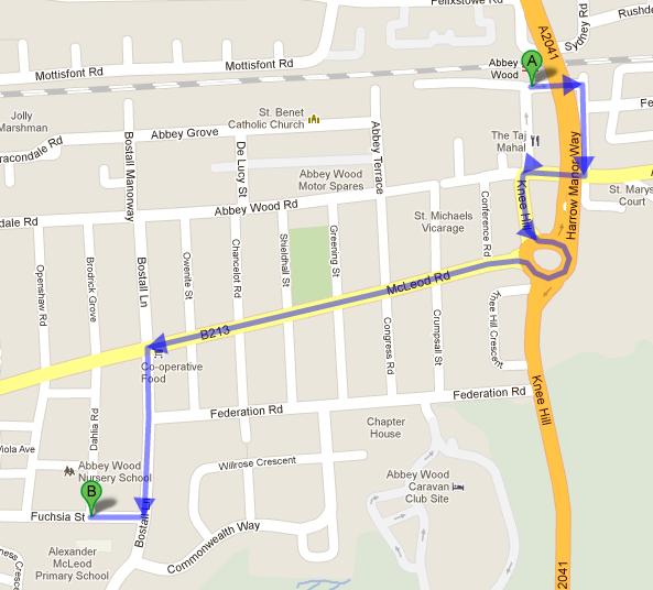 From the Abbey Wood rail station move east on Gayton Rd towards Florence Rd. Turn right onto Florence Rd, and then take the 1st right onto Abbey Wood Rd/B213. Take the 1st left onto Knee Hill/B213 and from the roundabout, take the 3rd exit onto McLeod Rd/B213. Now turn left onto Bostall Ln and after that, turn right onto Fuchsia St. You will find Alexander McLeod Primary School on your left hand side. Click Driving Dricetions to Alexander McLeod Primary School if you are interested in looking at a detailed route map.