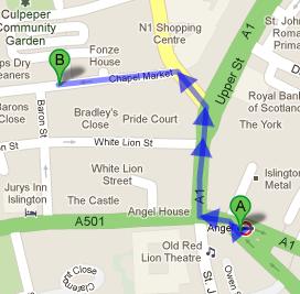 Angel tube station is about 0.3 miles away from Angel Pet Supplies Store. Patrons can easily cover this gap on foot in roughly 6 minutes. They need to head northwest on Goswell Road/A1 towards Torrens Street in order to reach Angel Pet Supplies Store from Angel tube station and then, should turn left onto City Road/A1. This will led them to the right turn onto Upper Street/A1, from where turn left onto Liverpool Road/B515 and finally turn left onto Chapel Market to find the destination on the left. Observe the walking directions to Angel Pet Supplies Store from Angel tube station to have better understanding of the course.