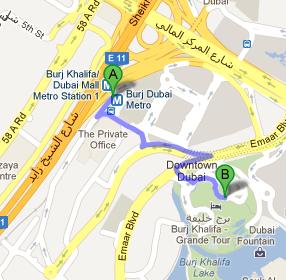 Head southwest from this metro station, before making a sharp left turn towards Emaar Blvd, from where commuters should turn slight right towards Emaar Blvd and then make a sharp left turn towards Emaar Blvd. This will guide them to another sharp right turn that goes onto Emaar Blvd, from where they will turn left and then make a slight right turn. After making this slight turn, commuters will turn left and enter the roundabout that will lead them to the destination, which is located on the right side.