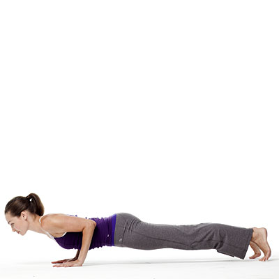 Stay in the push up position, but adjust such that your body is in a straight line from head to heels. The abs should be tightly contracted and hold for 5 breadths.