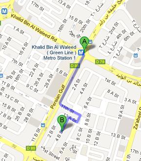 Khalid Bin Al Waleed Metro Station 1 is situated at a distance of 1.o kilometre from Bikanervala Restaurant and a metro user can easily bridge this gap on foot in about 13 minutes, if he or she follows these directions: