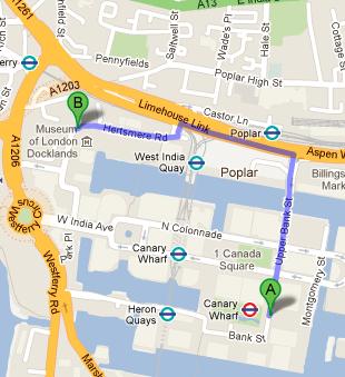 Canary Wharf tube station is the nearest London Underground service near Museum of London Docklands. The gap between these two sites is close to 0.7 miles, which can be covered by walk in 14 minutes. To begin this journey from the Canary Wharf tube station commuters should head north on Upper Bank Street towards Canada Square and then, turn slight left to stay on Upper Bank Street. This will lead them to the left turn onto Aspen Way/A1261, continue to follow A1261 and then, turn left onto Hertsmere Road. Finally commuter will take a right turn by staying on Hertsmere Road and soon they will locate the destination on the left. View Map