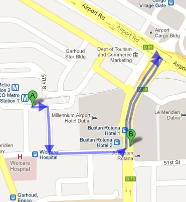 Bustan Rotana Hotel 2 – Dubai bus stop is 11 seconds walk from the Blue Elephant Restaurant, as the gap between these two sites is close to just 14 meters. So after landing at this bus stop from bus number 32C, bus user needs to head south course on D 70 to find the destination. View map for directions.