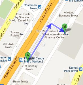 Financial Centre Metro Station 1 is 6 minutes walk from the Blue Rain Restaurant in the Ritz Carlton Hotel of Dubai, because the gap between these two sites is close to 450 meters. All patrons of this metro station need to do is to head in the northeast course and then make a right turn. After which they have to turn right once again in order to locate the destination few meters away on the left side.