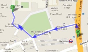 0.2 miles away from the Barbican Transit Station, L Café Du Marche is situated. By walk it will take approximately 4 minutes to wrap up the required distance between the two locations. You will have to walk in the North direction on the Aldersgate St/A1. Take a left turn when you cover 144 feet length and continue your walk on the Charterhouse Square. Take another right turn and head towards Charterhouse Mews, where the restaurant is actually situated. In order to have a detailed view of walking directions Click Here!