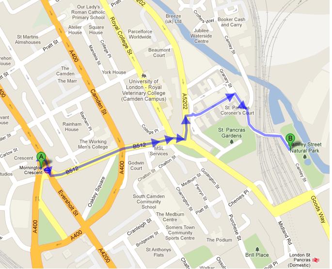 Mornington Crescent underground station is the nearest tube station from Camley Street natural Park. One can cover the 0.7 mile distance in 14 minutes on foot between the natural park and the tube station. From the tube station head north and then take a sharp right onto Camden High St. Now make a left turn to get onto Crowndale Rd and take a slight right onto Pancras Rd. Turn left onto St Pancras Way. Make a right turn toward Ganary st and then turn right onto Ganary St. Now, turn right onto Camley St which will take you to the natural Park. View Map