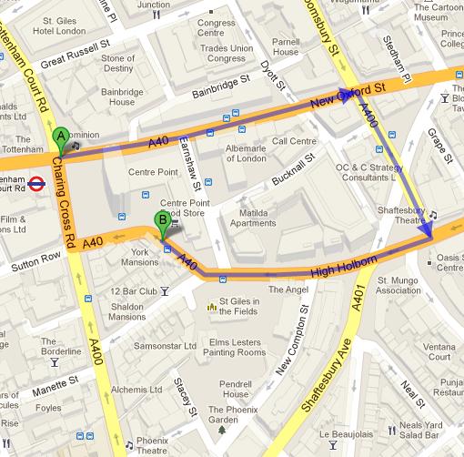 The Totenham Court tube station drops passengers off only a few feet away from Center Point Food street. Most people can quickly walk over to the store if they make a left onto Charring Cross and then a right onto Andrew Borde street. If you prefer to drive, then you will need to go around and take New Oxford Street going East. You will then make a right on Bloomsbury street and another right on High Holborn. View Map.