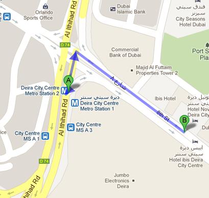 Deira City Centre Metro Station 2 is 400 metres away from the China Times Restaurant, and on foot this journey can be completed in roughly 5 minutes. If a patron heads southwest towards Al Ithihad Road/D 74, then takes a sharp right turn onto Al Ithihad Road/D 74, from where a commuter needs to turn right onto 8th Street, from where destination is not too far and can be located few meters away on the left side. Directions from Diera City Centre Metro Station 2 to China Times Restaurant.