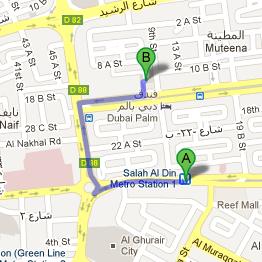 Head west on Salahuddin Road/D 80 towards 1 C Street, then make a slight right turn while staying on Salahuddin Road/D 80 and afterwards at the roundabout, take the second exit onto Omar Bin Al Khattab Road/D 88. Then turn right onto Al Muteena Street from where commuters should turn left at 9th Street before making a right turn in order to locate the destination on the right side. Directions from Salah Al Din Metro Station 2 to Chopstix Restaurant.