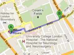 Russell Square tube station is 0.4 miles away from Coram's Fields Nursery School. By walk from the transit station it will take 7 minutes to reach the school. Take an exit from the station and head east on Colonnade towards Greenville St/B504, then take a right turn onto B504. After covering 0.1 mile take the last left turn onto Guilford St/B502, your destination will be on the left side of the street. For a detailed view of the pedestrian view you can check this link.