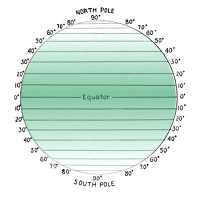 The lines of latitude range from 0° (Equator) to 90° (North and South Poles) whereas lines of longitude range 0° (prime Meridian) to 180°.