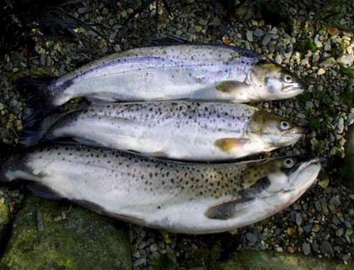 The head of the sea trout is somewhat pointed whereas the salmon has a rounder head. Similarly, the body of the salmon is streamlined and slender whereas the trout has a roundish body. The salmon has a few spots and the trout is heavily spotted.