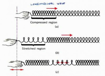 The expansion and compression in a particular medium produces longitudinal waves. These waves are not parabolic and consist of compressions and rarefactions, instead of crests and troughs. Particles of the medium actually transfer energy to the one next to them and hence, the energy is transmitted from one point to another. These mechanical waves travel in the same direction as the wave itself does. Longitudinal waves can travel through solids, liquids and even gasses easily, unlike transverse waves.