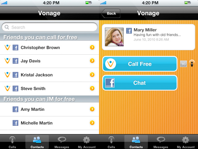Vonage Facebook app gives you an opportunity to get in touch with your friends on Facebook and you can post a new status directly from the app through your phone. However, you cannot do this through Viber.
