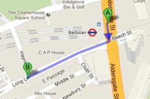 After taking an exit from the Barbican Rapid Transit, you will have to travel 0.1 miles by foot in order to reach the door step of your destination. This 2 minute trip has to be started in south direction on the Aldersgate St/A1. After covering 92 feet, head towards Long Ln and keep going until you wrap up 472 feet length. This link will help you out by providing a detailed route map.