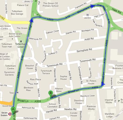 If you want to reach the center by tube, the best option is the Seven Sisters tube station. From there, you can take High Road north and turn right on Monument way. You will see a fork shaped junction at the road and need to keep to the right on The Hale. Once you reach Broad Lane, make a right and you will see the center on your left. View Map.
