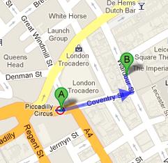 Family Leisure Holdings Ltd is located 0.1 mile away from Piccadilly Circus tube station, which makes it a 2 minutes journey by walk. All patrons need to do is head east on Coventry Street/A4 towards Great Windmill Street from Piccadilly Circus tube station and then continue to follow Coventry Street. This will bring the patrons onto Wardour Street after taking a left turn. After taking this left on Wardour Street, patrons can find the destination on the left side a few feet away. Directions from Piccadilly Circus tube station to Family Leisure Holdings Ltd.