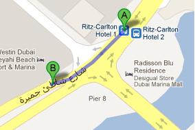 Bus stop Ritz-Carlton Hotel 1 is 140 meters away from the organization, 2 minutes walk will allow you to cover the required distance. After getting of the bus, head straight in the southwest direction on to Jumeirah Beach Rd, and keep on striding until you reach at your destination. The only route that makes a stop at the Ritz-Carlton Hotel 1 is 8 from Ibn Battuta Metro Station 1. For detail route take a look at the pedestrian path.