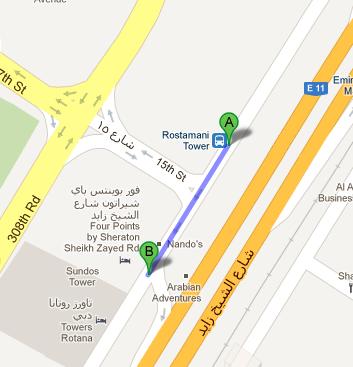 The name of the nearest bus stop to Four Points by Sheraton Hotel is Rostamani Tower – Dubai and bus numbers 21, 98E and F11 have stops at this station. This bus stop is hardly 160 metres away from Four Points by Sheraton Hotel, and by walk it will take you about 2 minutes to bridge this gap. As far as directions from the bus stop to this hotel are concerned, bus users should head in the southwest direction towards 15th Street and soon they will be able to find the destination on the right side. Directions from Rostamani Tower - Dubai to Four Points by Sheraton Hotel.