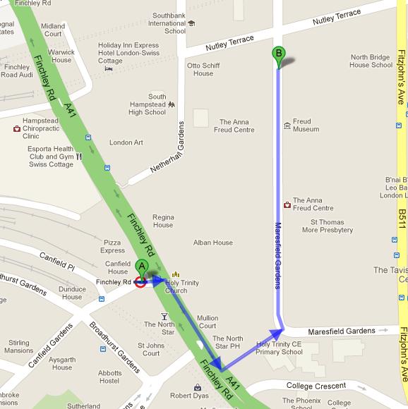 “Nutley Terrace (Stop)” is just 0.2 miles away from Freud museum and the distance can be covered in 4 minutes. Use bus number 46 to reach the bus stop. From the bus stop move northward on Fitzjohn's Ave and make a left turn onto Nutley terrace and then turn left onto Maresfield Gardens. You will spot the museum on your left side.View map