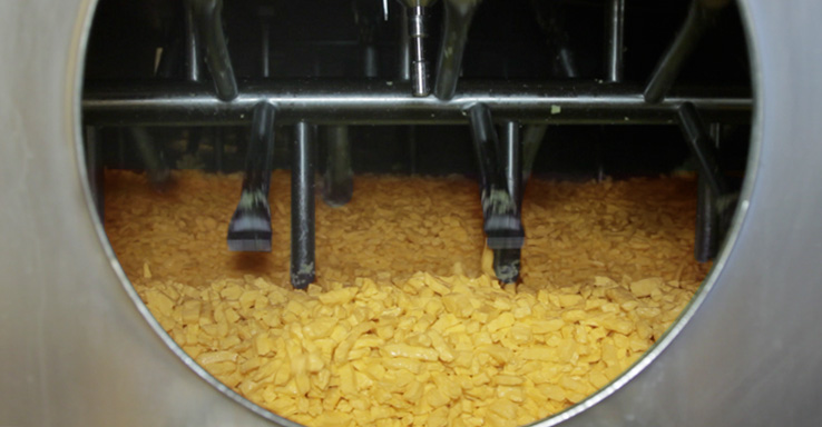 Once milk gets thick then cutting process starts in order to separate liquid (whey) from milk solid (curds). After cutting large pieces of curds are cooked at slow heated temperature.