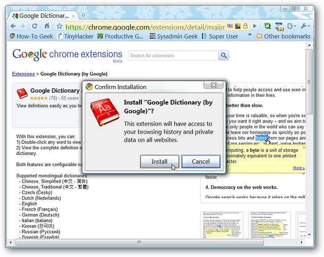 Go to http://chrome.google.com/extensions and search for 'Google Dictionary by Google' and confirm the installation. Press “Install” to start the installation process.