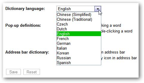 Below is the image, where you will be given options for Google Dictionary. Select which dictionary language you want to have in your browser. Also decide what Pop-up definitions you want to select. And, you want to have Address bar dictionary or not.