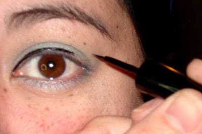 For the eyeliner, take a wet slanted brush dipped in a dark eyeshadow. Lining closely as possible to the upper eyelashes, expand from the inner to the outer corner.