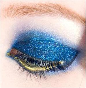 Apply blue glitter eyeshadow to upper eyelid until the crease and blend it well. Grab a golden eye pencil and apply it the entire lower eyelid. Dab some slightly glittery nude eye shadow to the brow bone in order to pop up your eye dramatically.