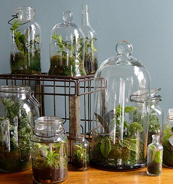Terrariums are small glass or plastic containers which hold entire self-sustaining systems within themselves, including soil, rocks, plants, and even a small creature like a frog or salamander. Terrariums are a great way to add an outdoor feel to your decor, or for an educational project for children.