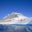 A luxury cruise liner completely filled with holidaying travellers puts down anchor in a far away island. Sunbathers come on the deck, young children enjoy themselves around the nearby pools and a few tourists who are sea sick go to the shore to swim near a snorkel at the beach or shop. All the guests are having the time of their life.