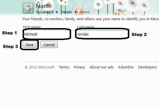 When you click on that option, Windows Live Messenger will open up a new window in your browser, which will take you straight to the page where you can edit your name. Just edit the First Name and Last Name text fields to the name you desire, and finally, click “Save”.