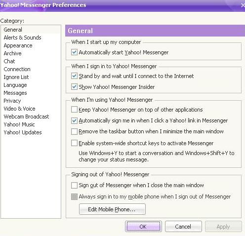 Now, click "General" at the top of the category list in the pane at the left of Yahoo Messenger’s dialog box.