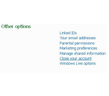 Now, click on “close you account” given below “Other Options.” You will the “close your account” option at second last, in between the “managed shared information” and “Windows Live Option.”