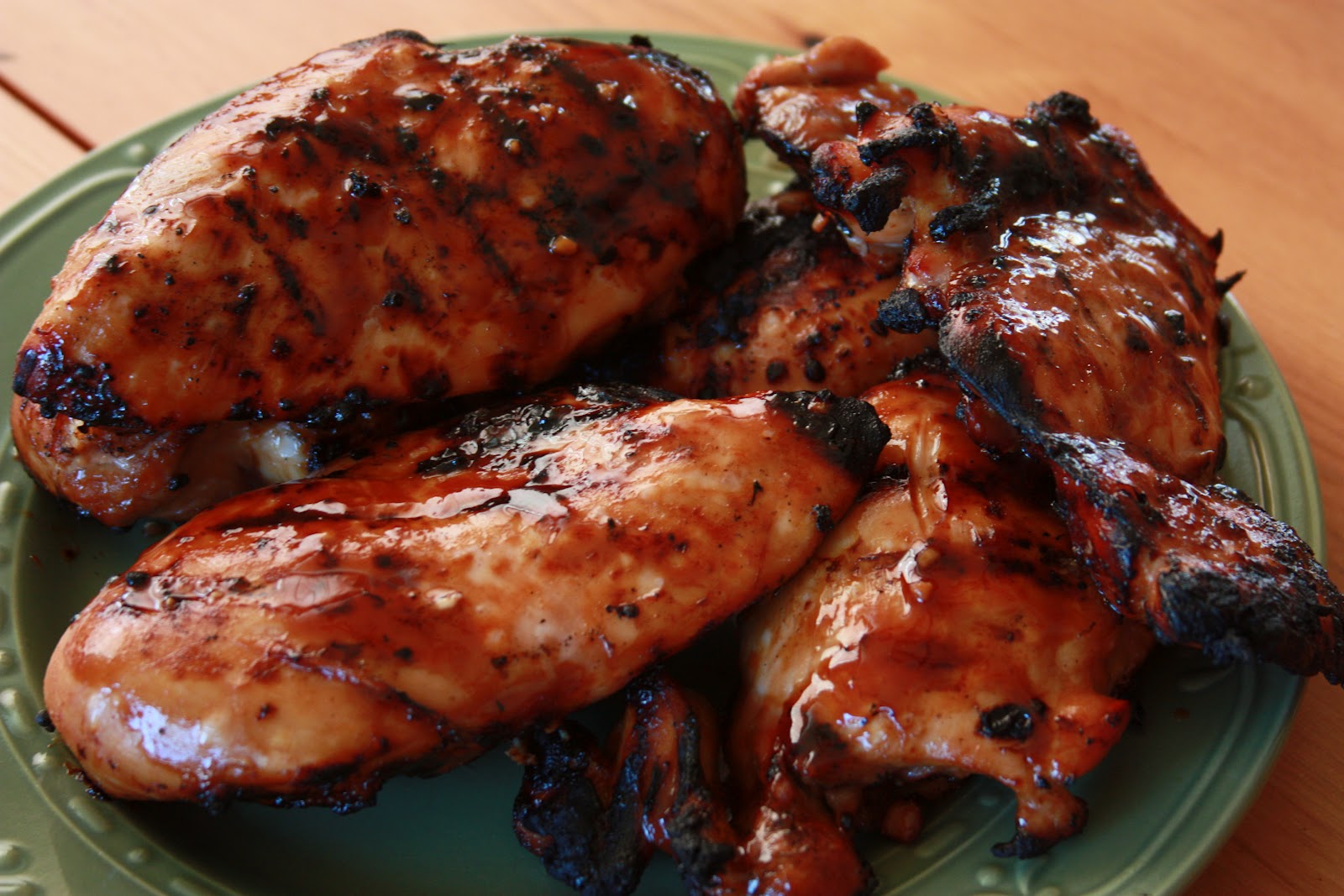 Wash the chicken pieces thoroughly under running water and pat dry with paper towels. Combine all saucy ingredients in a medium sized mixing bowl and mix them thoroughly. Apply this concoction to the chicken pieces with a clean kitchen brush and set aside for 15 to 50 minutes. Grill the marinated chicken pieces over barbecue for 35 to 40 minutes or until the chicken is done, turning occasionally and basting with the sauce.