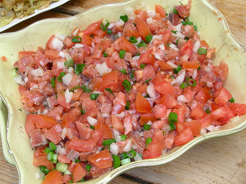 Season the salmon fillet with salt and shred into small pieces in a medium sized bowl. Add diced tomatoes and onions to the shredded fish and combine all the three ingredients thoroughly with your hands. Cover the bowl with a plastic wrap and chill in the fridge for one hour before serving.