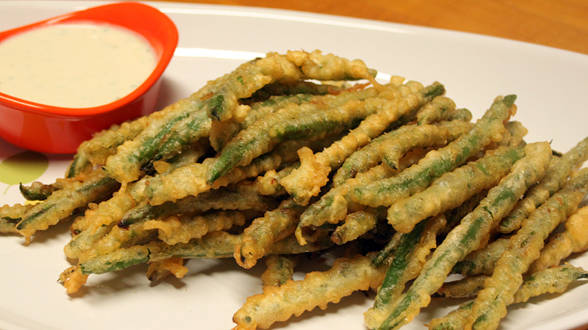 Trim and rinse the green beans and set them aside to dry. When the beans are completely dry put them in a medium sized mixing bowl and toss thoroughly with buttermilk. In another bowl, mix together cornmeal, flour, baking powder, cayenne (if using) and two teaspoons of salt. Toss the beans in the flour mixture to coat them thoroughly. Now pour oil in a wide heavy pot and heat it to 350-375 degrees Fahrenheit. Shaking excess flour off the beans, add them to the hot oil in a single layer and fry for three minutes or until they are tender and golden brown. Remove the fried beans from the hot oil with a slotted spoon and put them in a plate lined with paper towels to remove excess oil. Sprinkle salt and serve hot with sauce or gravy of your choice.