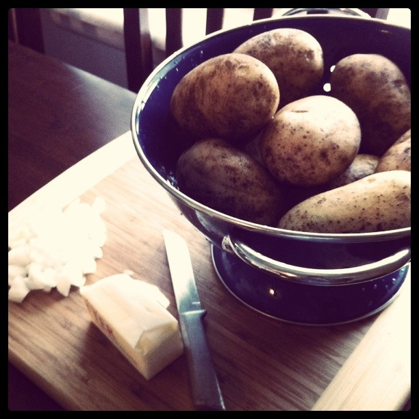 Toss the potatoes into a strainer, and give them a thorough wash with cold water in the sink. Since potatoes are baked with the skin, it is essential to clean the potatoes thoroughly. Use a stiff bristle brush to scrub the potatoes free of dirt and soil.