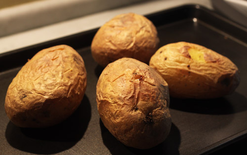 Place the potatoes on your oven rack for baking, and make sure you keep a baking sheet underneath, to catch any drips. Bake for roughly an hour, keeping the oven temperature at 350 degrees F. Check by poking them with a fork – you’ll know they are ready once the potatoes become soft on the inside, and the skin becomes crispy.