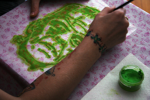 First take a print out of the design in black and white color on a white paper. Next, staple or attach this design to the back of a contact paper. You now have to carefully cut out the design on the paper with the help of a paper knife by outlining or marking its border. Now insert a cardboard or plastic material  between the front and backside of the t-shirt which will serve as a tweener. Now place this design on the T-shirt by peeling off the sticky backside of the contact paper. Now cover the region surrounding the design with rough papers so that the paint doesn’t get to other areas of the T-shirt. Now start applying the fabric paint with the help of a paint brush. Wait until the paint is dry. Now slowly peel off the design from your T-shirt.