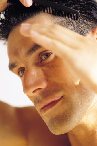 Using your index and middle fingers you now need to pick a section of his hair from the top and raise it up straight to see the ends.