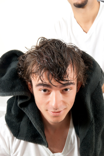 Ask your boyfriend to wash his hair before you start cutting it. He should shampoo it properly and then leave the hair slightly wet.