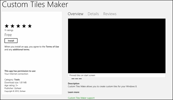 First of all, you need to download Custom Tile Maker on Windows 8, which can be found from the App Store. After downloading, install it according to the given procedure. Since this is a Modern Windows 8 app, so it will be automatically installed from the Windows Store. Now, look for the Custom Tile Maker in Store and install it.