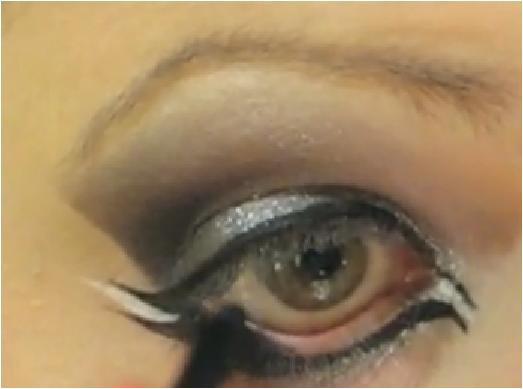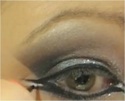 Take another clean eyeliner brush, dip it in the white cake gel eyeliner and apply it in between the double wings on the outer side of your eyes. Also, apply it in-between the tail effete on the inner side of your eye. However, if you do not have a white eyeliner cake, you can simply use the white eyeliner pencil.